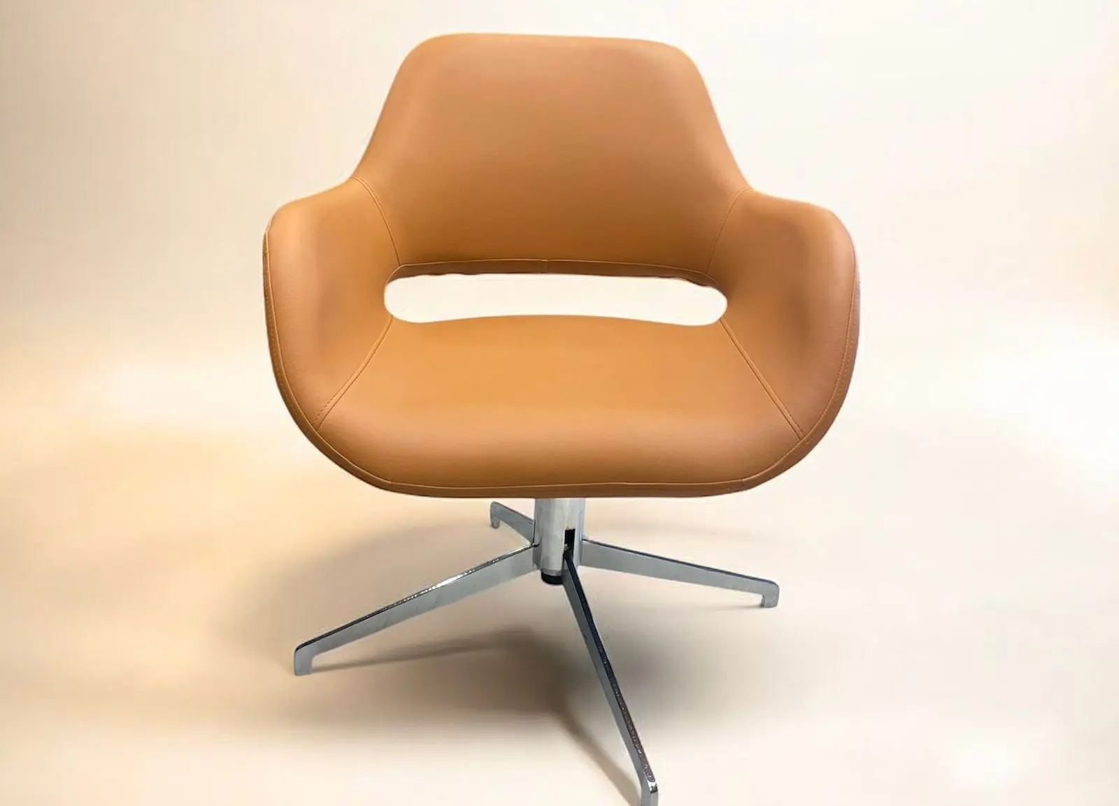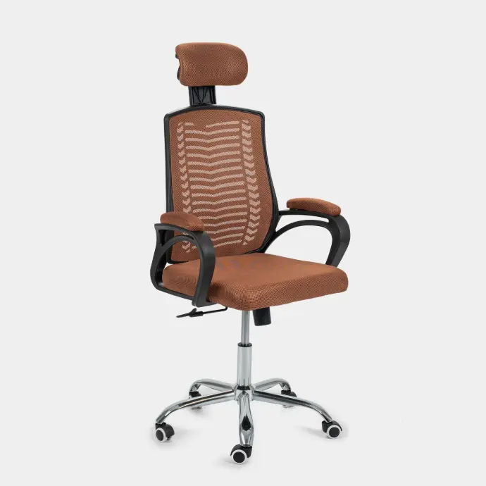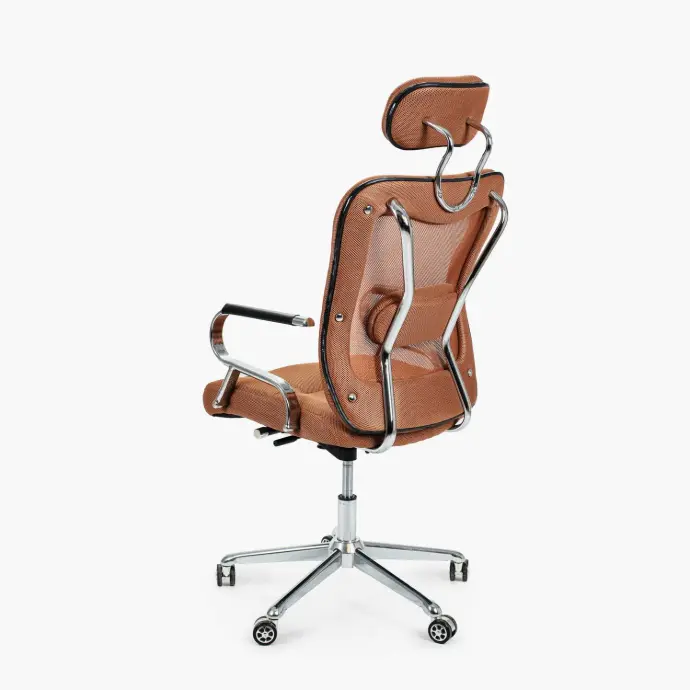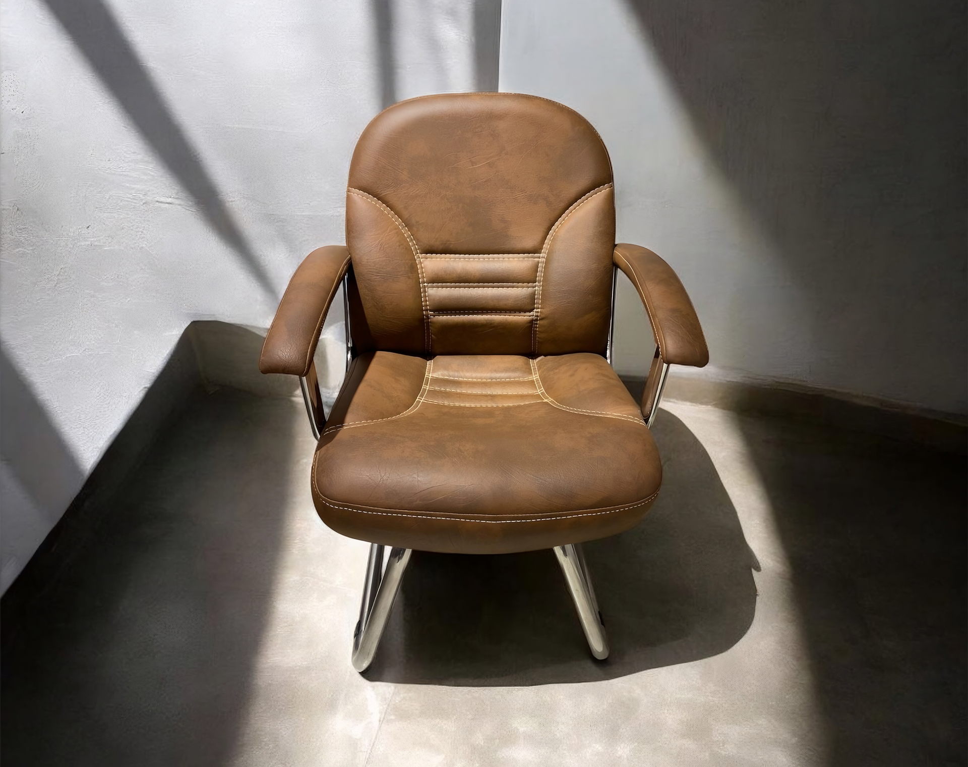 يتميز بتنجيد جلد بني فاخر بخياطة دقيقة تضيف لمسة فخامة، مع مقعد وظهر مبطنين بإسفنج عالي الكثافة لراحة تدوم طوال ساعات العمل. مساند الذراعين مبطنة لتوفير دعم إضافي، بينما القاعدة المعدنية الثابتة تمنح ثباتًا وقوة تحمل عالية.